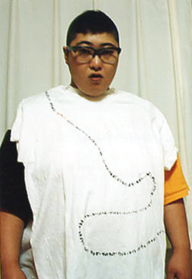 Tシャツの右胸の部分に 生地用の赤絵具で